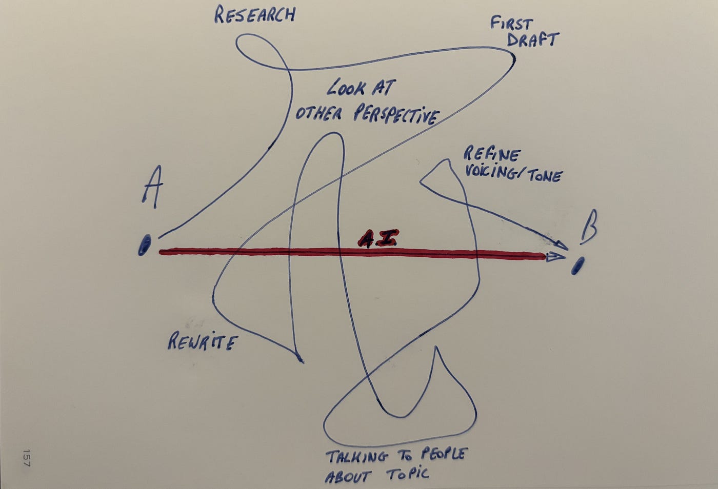 The process of writing is: (1) gathering data and ideas; (2) processing and merging them logically together; and finally (3) writing them out. AI can replace all three stages. That is concerning. It’s like someone takes a plane from San Diego to New York and then pretends to have seen the entire United States. You save time, yes, but you miss all the valuable things along the way. By car, you might sometimes drive the wrong way, and it would certainly take much longer, but you would learn and remember a lot from the experience.